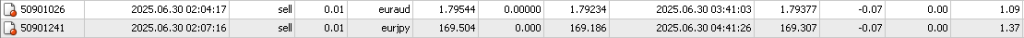 Both already close, for EURAUD still have chance to repeat,right now alrealy opened again with floating profit. Hurry execute your MT4.